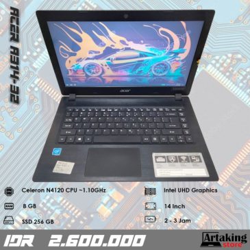 Spesifikasi: Proceccor Celeron N4120 CPU ~ 1.10GHz RAM 8 GB SSD 256 GB Layar 14 inch VGA Intel UHD Graphics Wifi – Webcam Baterai 2 – 3 jam Kondisi : Barang normal, siap pakai… kelengkapan : unit laptop, charger