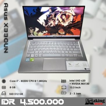 Processor Core i7 – 8550U CPU @1.80GHz Ram 8 GB VGA Intel UHD Graphics 620 + Nvidia MX130 Layar 13.3 Inch SSD 512 GB Wifi – Webcam Baterai 2 jam