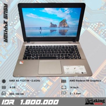 Processor AMD A9 – 9225 R4 ~2.6GHz RAM 4 GB HDD 500 GB Layar 14 inch VGA AMD Radeon R4 Graphics Wifi – Webcam – DVD RW Baterai 2 – 3 jam