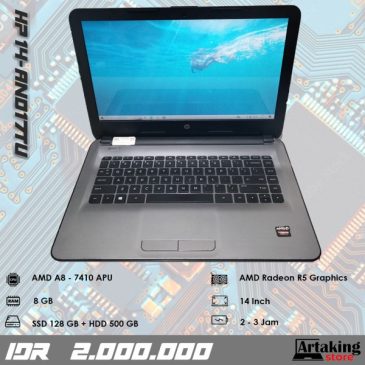 Proceccor AMD A8 – 7410 APU RAM 8 GB SSD 128 GB + HDD 500 GB Layar 14 inch VGA AMD Radeon R5 Graphics Baterai 2 -3 jam