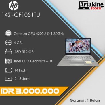 Proceccor Celeron CPU 4205U ~ 1.80GHz RAM 4 GB SSD 512 GB Layar 14 inch VGA Intel UHD Graphics Wifi – Webcam – DVD RW Baterai 2 – 3 jam