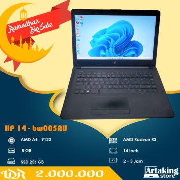 Processor AMD A4 -9120 Ram 8 GB VGA AMD Radeon R3 Layar 14 Inch SSD 256 GB Wifi – Webcam – DVD Baterai 2 – 3 jam
